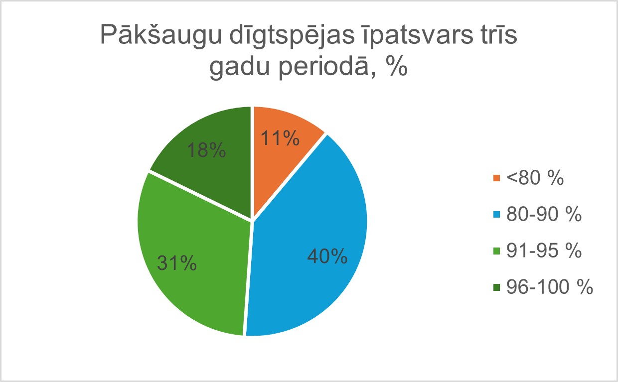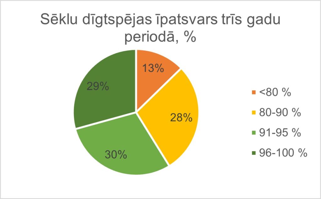 Kopumā dīgtspējas rādītāji saglabājas salīdzinoši augstā līmenī, tomēr to sadalījums pa dīgtspējas intervāliem laika gaitā mainās. Atsevišķos gados palielinās paraugu īpatsvars ar vidēju dīgtspēju (80–90%), vienlaikus samazinoties ļoti augstas (96–100%) vai ļoti zemas (<80%) dīgtspējas paraugu īpatsvaram.