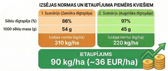 Piemērā ar atšķirīgu kviešu dīgtspēju un sēklu rupjumu, nosakot sēklu kvalitātes rādītājus, tie ļauj samazināt izsējas normu par 90 kg/ha, kas pie sēklas cenas 400 eiro/t dod tiešu izmaksu ietaupījumu 36 eiro/ha. Ja saimniecībā apsēj 200 ha, tas jau ir 7200 eiro. Un tas ir tikai uz sēklas izmaksu rēķina.