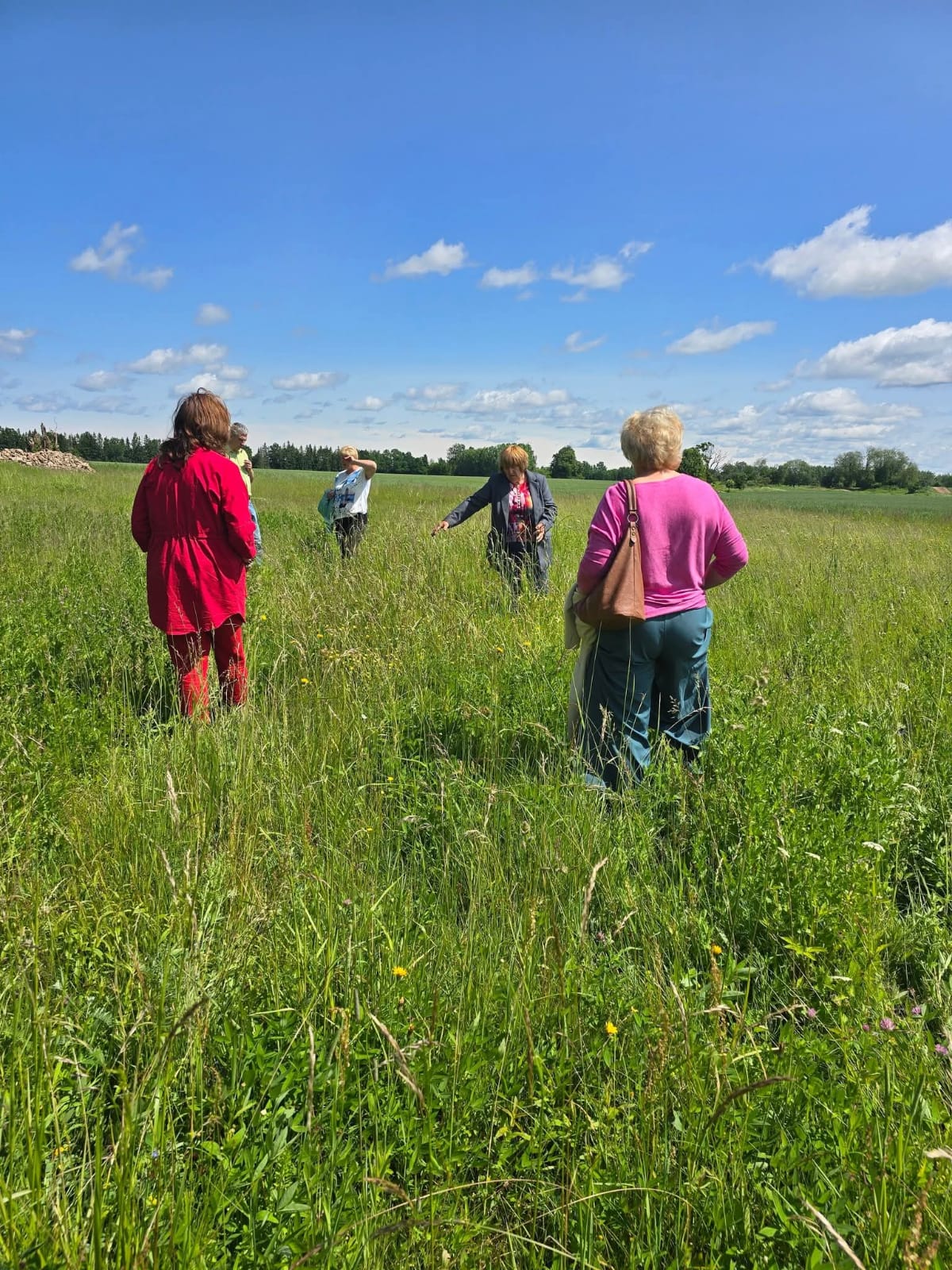 Lauka dienas otrajā daļā dalībnieki devās apskatīt demonstrējuma laukus, piedalījās diskusijās, daloties ar savu pieredzi zālāju bioloģiskās daudzveidības atjaunošanā, sākot ar krūmu izciršanu, zāles regulāru pļaušanu un novākšanu no lauka, bioloģiski vērtīgu zālāju sugu piesēju, kā arī noganīšanu. Izraisījās diskusija, kādus mājdzīvniekus labāk turēt un kāpēc. Jo dažviet ir lauki, kurus praktiski nav iespējams nopļaut. Mājdzīvnieki palīdz izplatīties augu sēklām. Lauka dienā piedalījās dalībnieces, kuras ražo produkciju no pļavās vāktiem augiem, kam piešķirta zīme – “Dabisko pļavu produkts”. Savukārt pārnestās zālāju velēnas “donorpļavas” īpašniece pastāstīja, cik ātri aizaugusi vieta, kur 2023. gadā tika noņemta velēna, lai pārnestu uz demonstrējuma lauku. Vēl viens iepriekš nenovērots augs – pļavā ziedošā dzegužpuķe – priecēja mūs visus šajā lauka dienā.