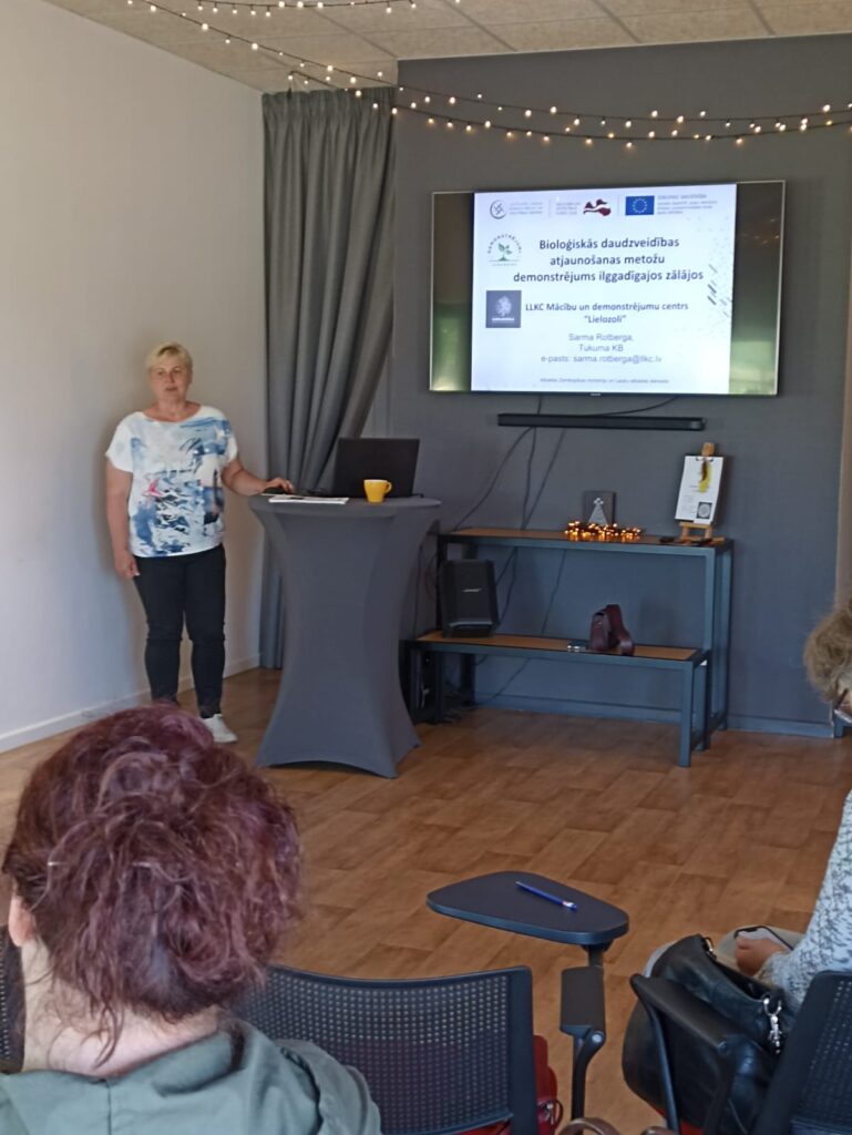 LLKC Tukuma konsultāciju biroja projektu vadītāja Sarma Rotberga iepazīstināja dalībniekus ar demonstrējuma gaitu. Kopējā demonstrējuma lauka platība ir 1,2 ha. Tas sadalīts četros lauciņos, kur katrā no tiem pielietota atšķirīga bioloģiskās daudzveidības atjaunošanas metode. Pirmais (kontroles) lauks, kurā konstatēts labākais botāniskais sastāvs, atstāts dabiskai sugu ienākšanai. Otrajā laukā veikta bioloģiski vērtīga zālāja sugu piesēja ilggadīgajā zālājā, kur 1/3 daļā lauka iesēts bioloģiski vērtīgu zālāju sēklu maisījums. Trešajā laukā veikta bioloģiski vērtīga zālāja zaļmasas izklāšana ilggadīgajā zālājā, savukārt ceturtajā laukā, tā centrā, 2022. gadā veikta augsnes ecēšana 6 x 40 m platā joslā un iesēti zvaguļi. 2023. gada rudenī veikta zālāju biotopa velēnas pārnese 30 m2 platībā. Visos demonstrējuma laukos veikti zālāja kopšanas un uzturēšanas darbi atbilstoši izstrādātajam apsaimniekošanas plānam, kā arī regulāri veikts zālāju botāniskā sastāva un bioloģiskās daudzveidības novērtējums.