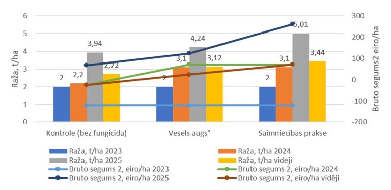 2023./2024. g. iesēti ziemas kvieši ‘Edvīns’. Ziemcietība – 7 balles. Pavasaris bija auksts un vēls. Lauku ilgi klāja sniegs, kas kusa lēni un līdz ar to mitrums saglabājās augsnē. Jūnija sākumā kviešu lapu dzeltenplankumainības ierobežošanai smidzināts fungicīds Input 1 l/ha, kas lietots tikai “Vesels augs” un saimnieka variantā. Savukārt 20. jūnijā veicot uzskaiti kontrolē, ar dzeltenplankumainību bija inficēti 20,08%, bet saimnieka un “Vesels augs” variantos attiecīgi 8,89 un 9,58%. Veģetācijas perioda laikā bija maz nokrišņu, kas ierobežoja augu attīstību. “Vesels augs” un saimnieka variantos iegūta augstākā raža – 3,1 t/ha. Aprēķinot bruto segumu kontroles un abiem pārējiem variantiem, secinām, ka arī viens smidzinājums ar fungicīdu dod būtisku peļņas ieguvumu uz ha, salīdzinot ar kontroli. Bruto 3 seguma starpība ir 116 eiro/ha.