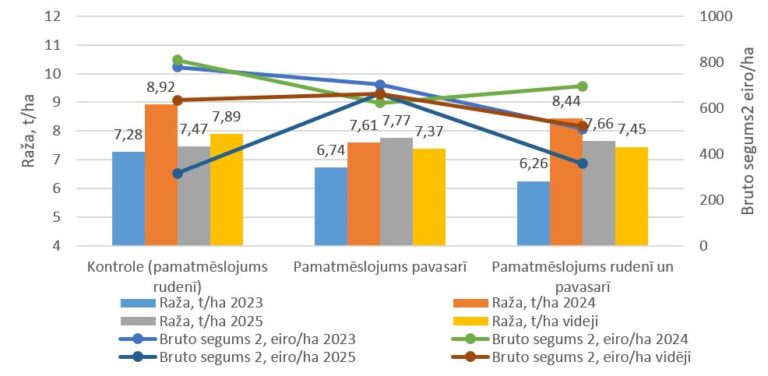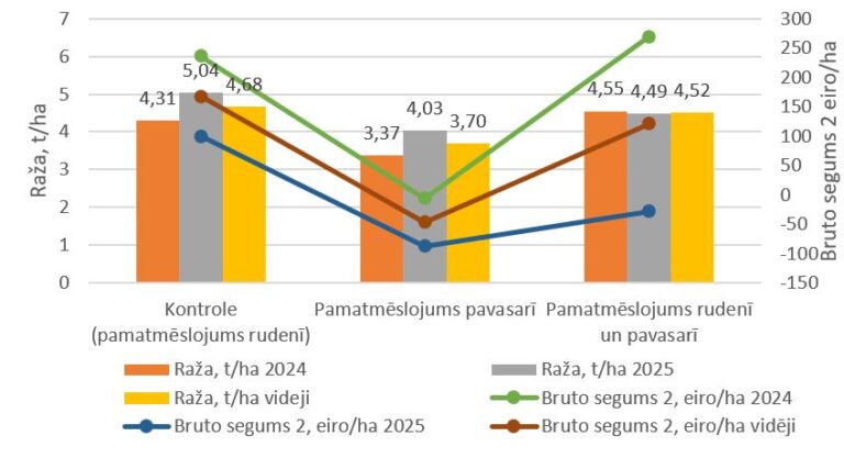 2024. gada augstāko ražu 4,55 t/ha ieguva, pamatmēslojumu lietojot dalītās devās gan rudenī, gan pavasarī, bet 2025. gadā augstākā raža 5,04 t/ha tika sasniegta kontroles variantā ar pamatmēslojumu rudenī. Pamatmēslojumu dodot tikai pavasarī, ražas pieaugums netika konstatēts, ekonomiskie aprēķini apstiprina, ka šim variantam ir zemākā ekonomiskā efektivitāte.
