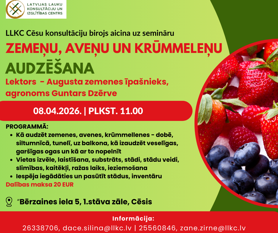 LLKC Cēsu konsultāciju birojs aicina uz semināru “Zemeņu, aveņu un krūmmelleņu audzēšana”