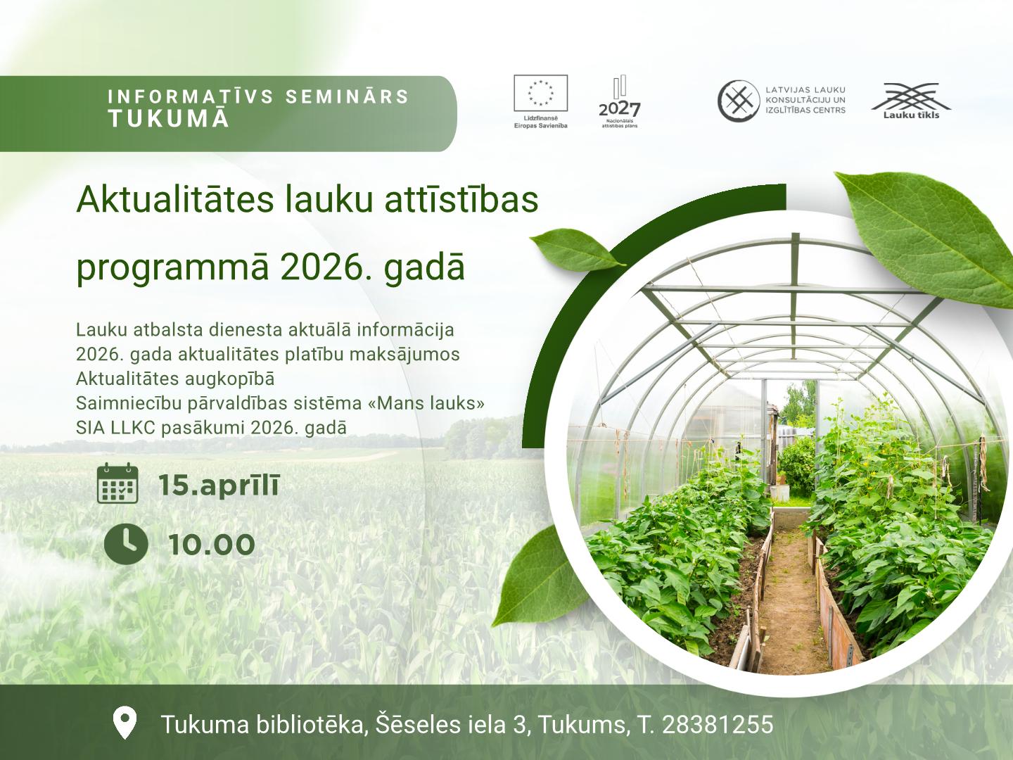 LLKC Tukuma konsultāciju birojs aicina lauksaimniekus uz semināru.