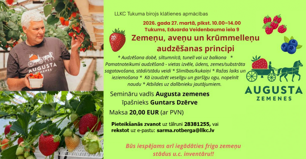 Tukuma konsultāciju birojs birojs aicina uz maksas apmācībām “Zemeņu, aveņu un krūmmelleņu audzēšanas principi”.