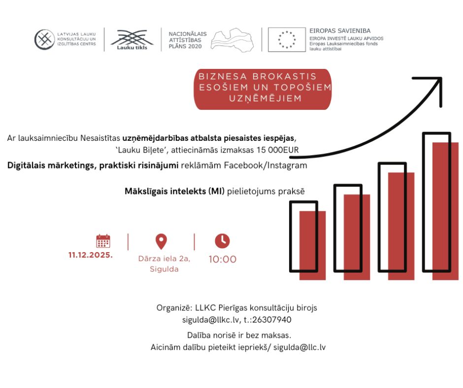 Lai kļūtu par uzņēmēji šodien ir daudzas iespējas. Kā viena no tām ir unikālā atbalsta programma ‘Lauku Biļete’. Atbalsts ir pieejams esošiem un topošiem uzņēmumiem. Ar attiecināmām izmaksām līdz 15 000EUR, atvieglotos pieteikšanās un atbalsta apguves nosacījumos, programma piedāvā grantu no 45% – 60%.