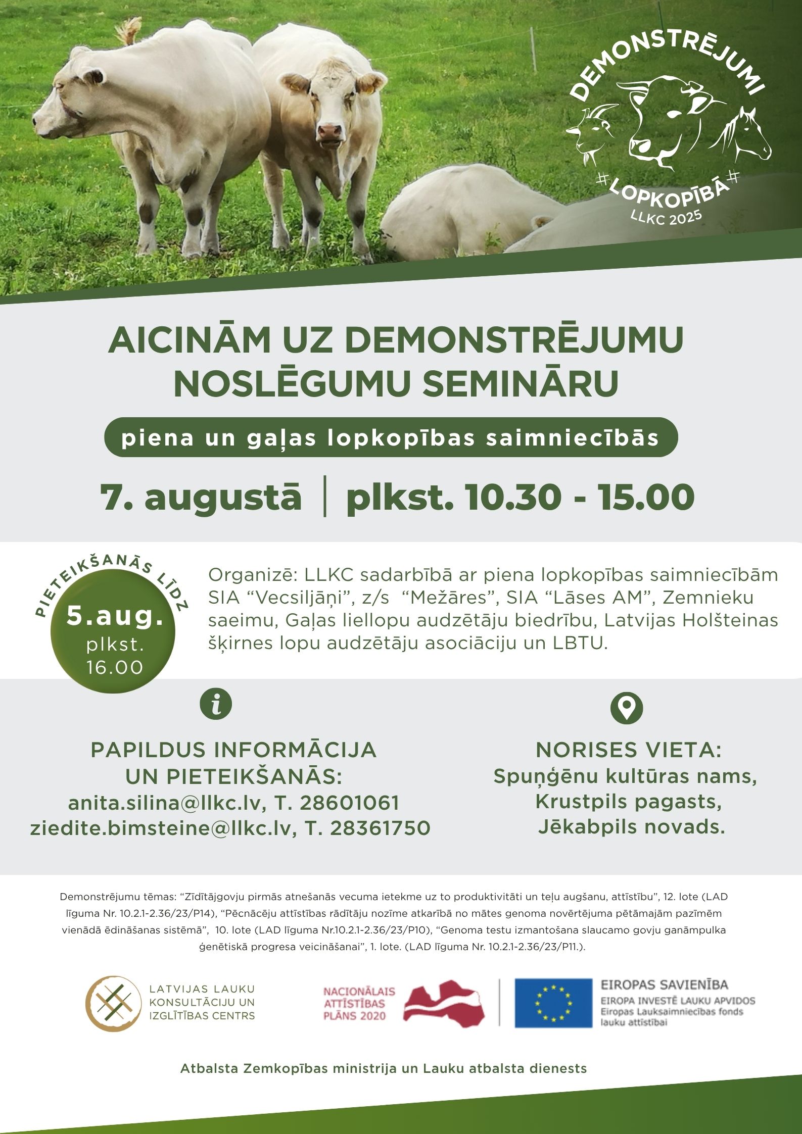 LLKC sadarbībā ar piena lopkopības saimniecībām SIA “Vecsiljāņi”, z/s “Mežāres”, SIA “Lāses AM”, Zemnieku saeimu, Gaļas liellopu audzētāju biedrību, Latvijas Holšteinas šķirnes lopu audzētāju asociāciju un LBTU aicina apmeklēt demonstrējumu noslēguma semināru.