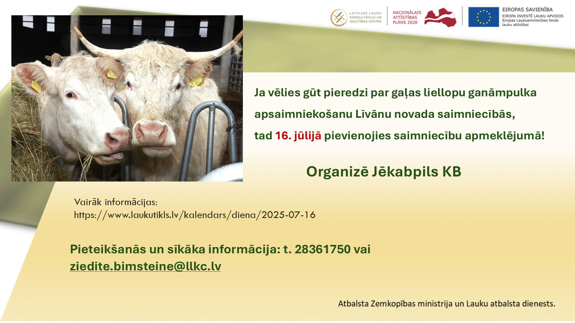 Ja vēlies iepazīt Līvānu novada Rožupes un Sutru pagastu gaļas lopkopības saimniecību pieredzi,16. jūlijā pievienojies Jēkabpils KB organizētajā saimniecību apmeklējumā.