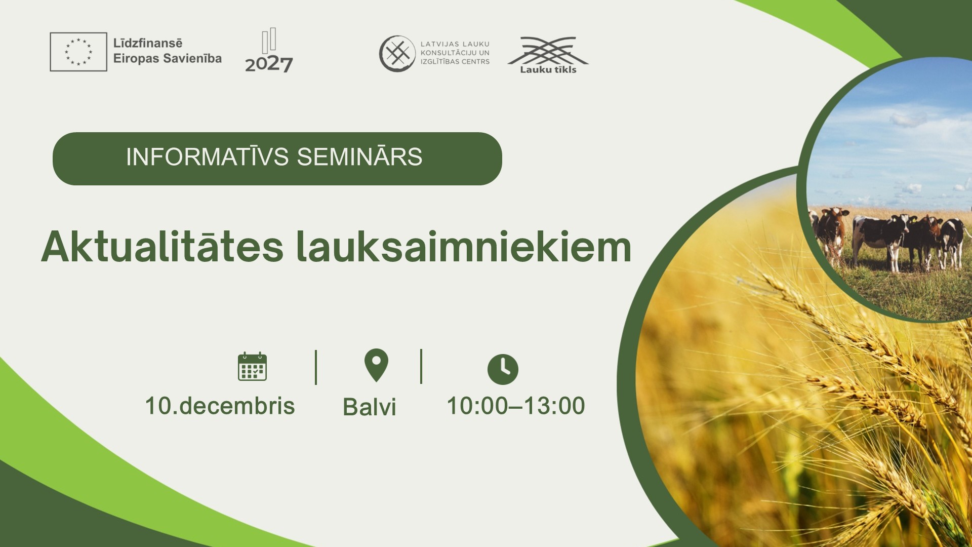 SIA LLKC Balvu birojs aicina lauksaimniekus un lauku uzņēmējus 10.decembrī plkst. 10:00 uz informatīvo semināru “Aktualitātes lauksaimniekiem”.