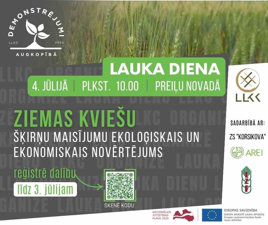 Latvijas Lauku konsultāciju un izglītības centrs (LLKC) sadarbībā ar zemnieku saimniecību “Korsikova” (Preiļu pagasts, Preiļu novads), Latvijas Zemnieku federāciju un Agroresursu un ekonomikas institūtu aicina piedalīties lauka dienā „Ziemas kviešu šķirņu maisījumu ekoloģiskais un ekonomiskais novērtējums”, kas notiks 2025. gada 4. jūlijā.