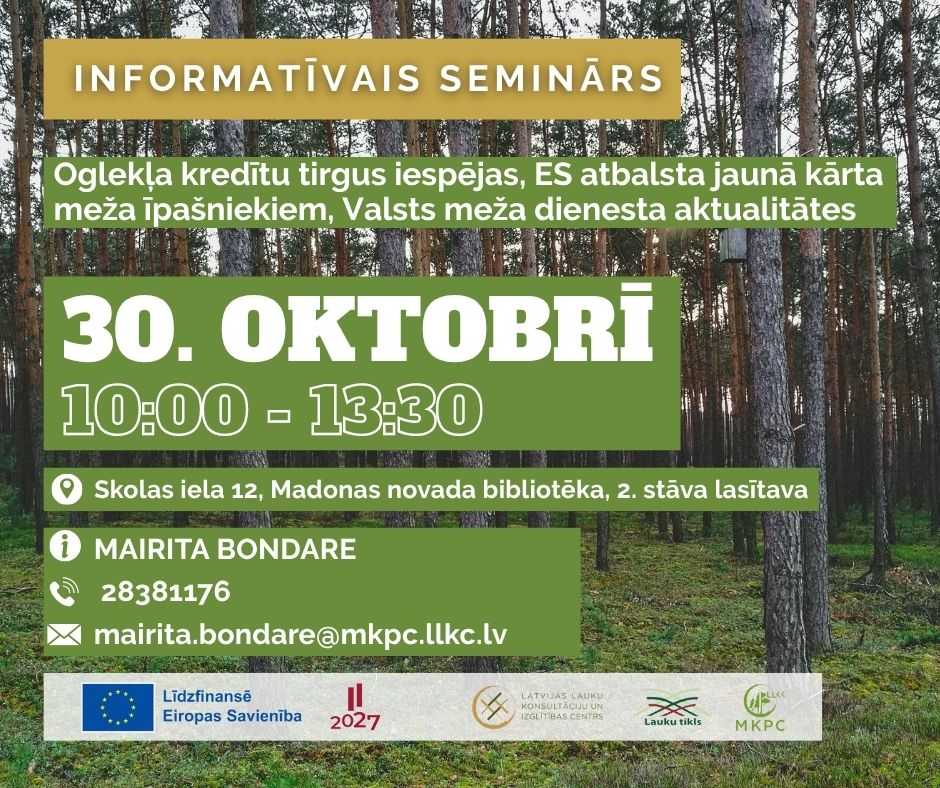 Aicinām pieteikties informatīvajam semināram “Oglekļa kredītu tirgus iespējas privātajos mežos/īpašumos. ES atbalsta kārta meža īpašniekiem no 19.11.-19.12. un aktualitātes no Valsts meža dienesta”.