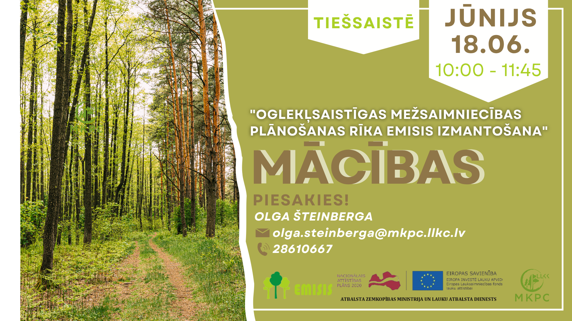 2025. gada 18. jūnijā plkst. 10.00 aicinām piedalīties tiešsaistes mācībās “Oglekļsaistīgas mežsaimniecības plānošanas rīka EMISIS izmantošana”, kurās būs iespēja iepazīties ar jaunākajiem rīkiem un pieejām ilgtspējīgā meža apsaimniekošanā, kā arī CO₂ piesaistes un SEG emisiju samazināšanas iespējām.