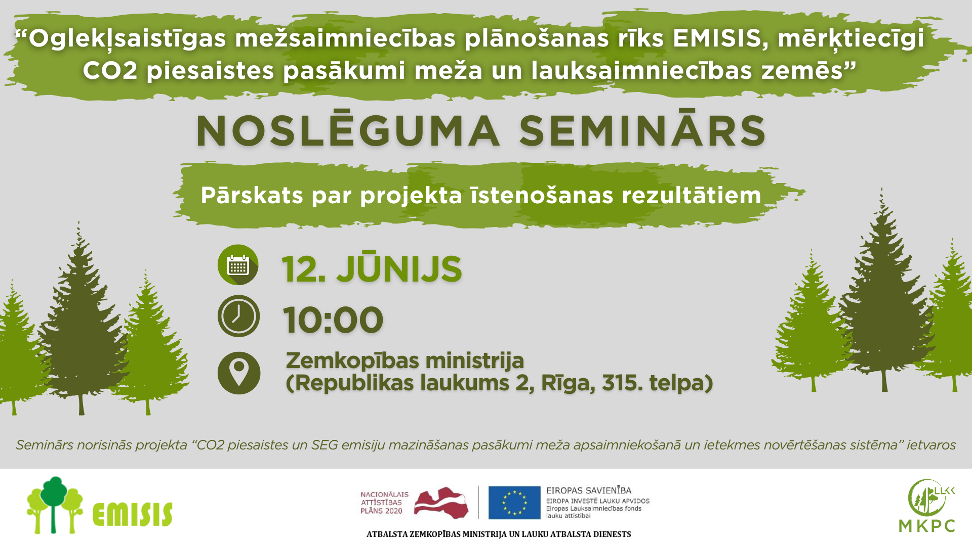 2025. gada 12. jūnijā Zemkopības ministrijā (Republikas laukums 2, Rīga, 315. telpa) notiks projekta “CO₂ piesaistes un SEG emisiju mazināšanas pasākumi meža apsaimniekošanā un ietekmes novērtēšanas sistēma” noslēguma seminārs.