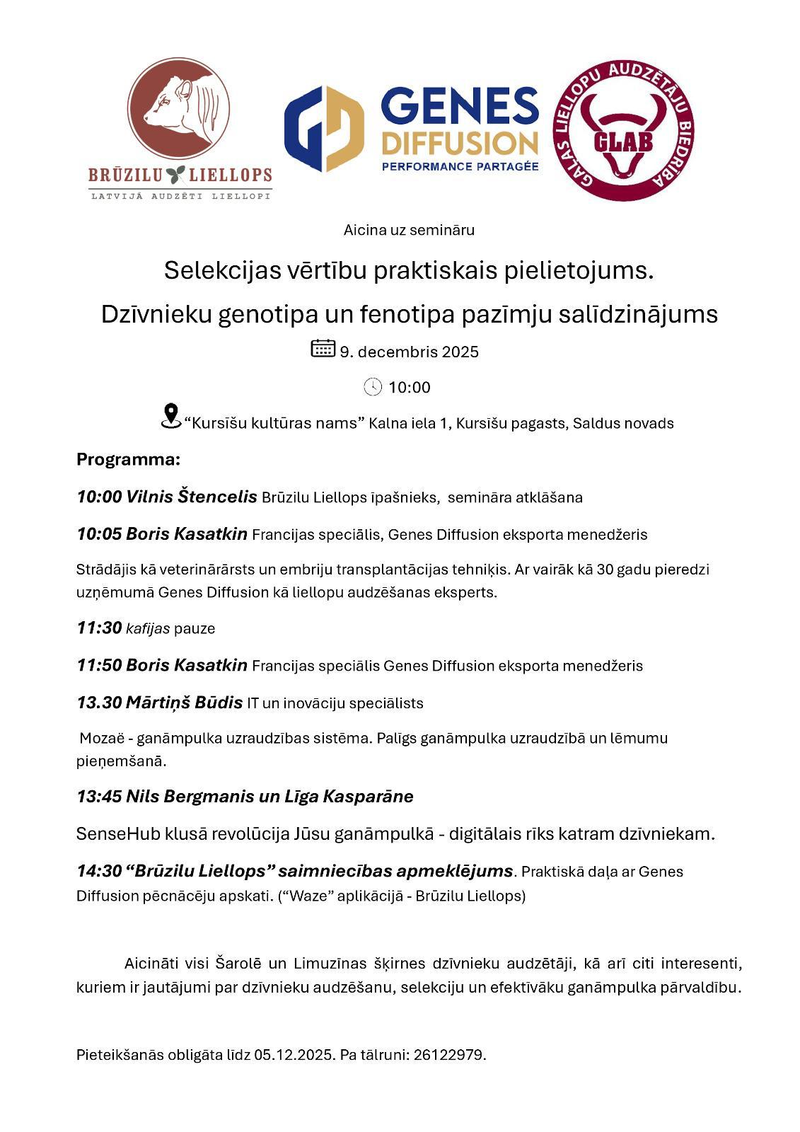 Aicināti Šarolē un Limuzīnas šķirnes dzīvnieku audzētāji, kā arī citi interesenti, kuriem ir jautājumi par dzīvnieku audzēšanu, selekciju un efektīvāku ganāmpulka pārvaldību.