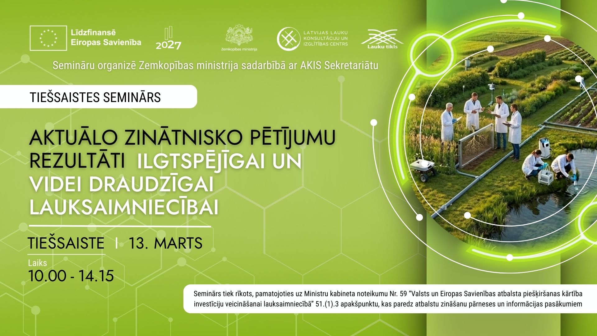 13. martā plkst. 10.00 Zoom platformā norisināsies Zemkopības ministrijas un Lauksaimniecisko zināšanu un inovācijas sistēmas (AKIS) Sekretariāta organizētais tiešsaistes seminārs “Aktuālo zinātnisko pētījumu rezultāti ilgtspējīgai un videi draudzīgai lauksaimniecībai”.