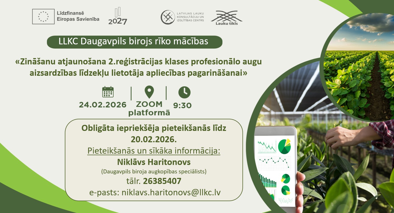 LLKC Daugavpils konsultāciju birojs organizē apmācības “Zināšanu atjaunošana 2.reģistrācijas klases profesionālo augu aizsardzības līdzekļu lietotāju apliecību pārreģistrēšanai”.